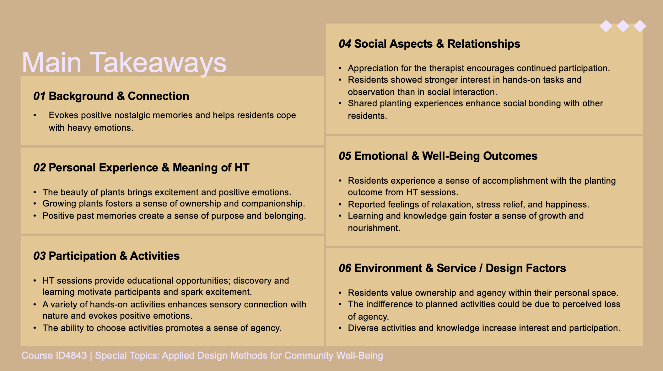 Examining how the design and delivery of horticultural therapy sessions influence the emotional, physical, and social well-being of older adults living in long-term care settings. Work done in collaboration with A.G. Rhodes nursing home.
