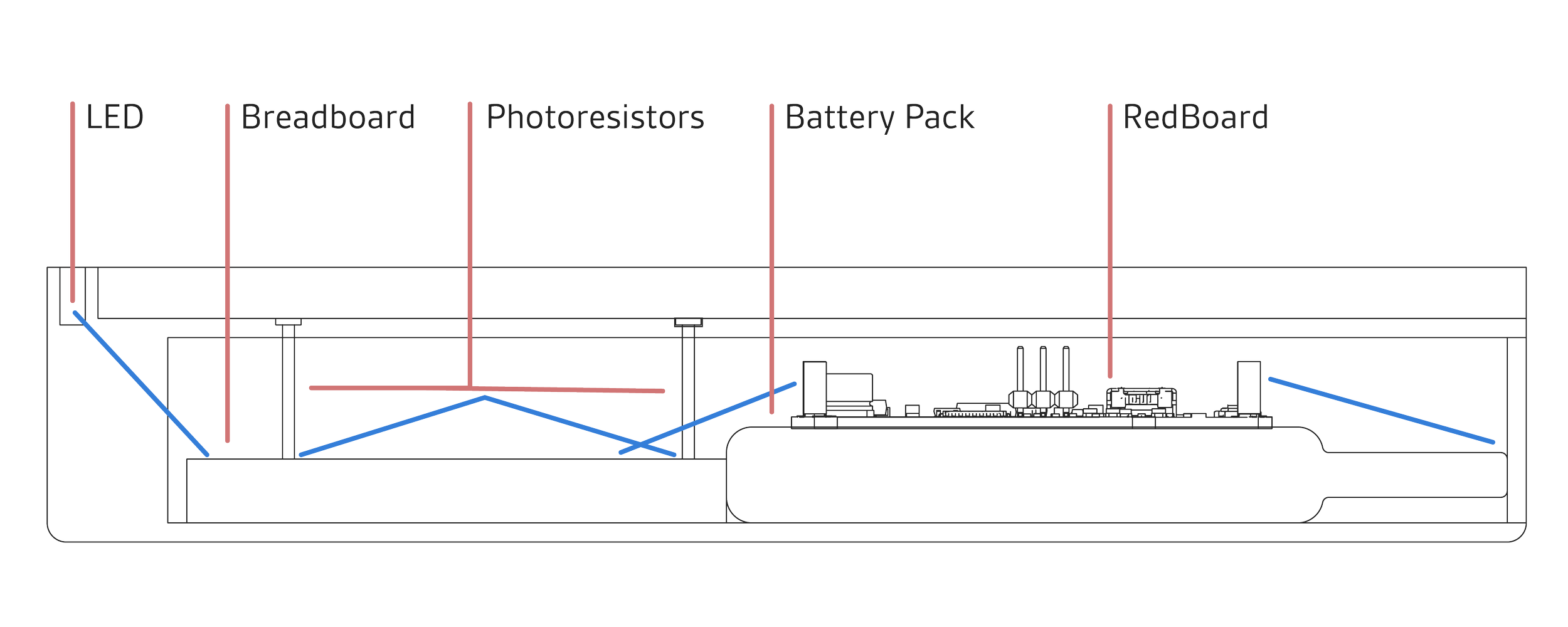 The components utilized include Neopixel LED sidelights, 2 photoresistors, 1 breadboard, an Anker battery pack, and a Sparkfun RedBoard,