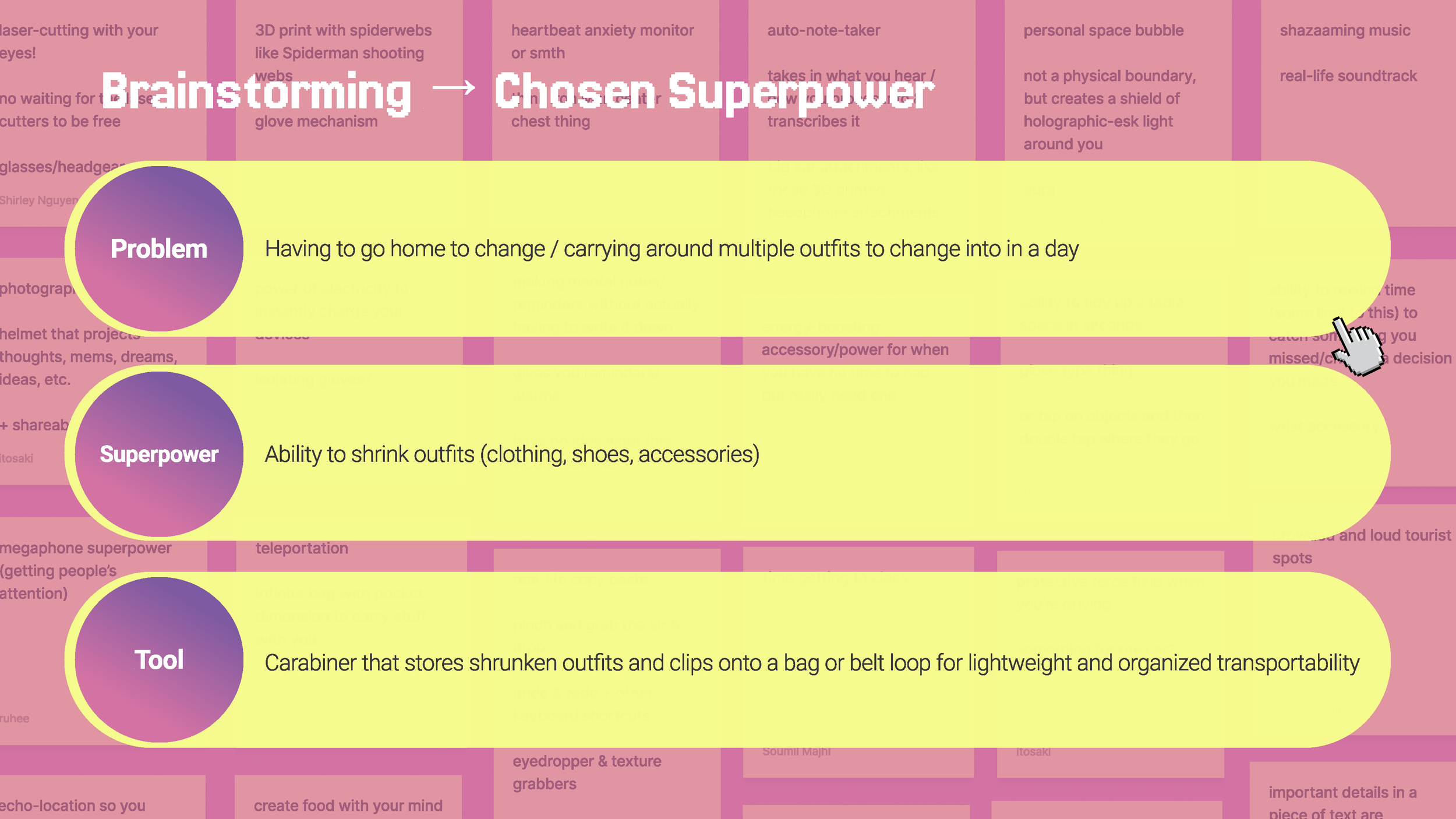 Identify a shared pain point. Invent a superpower that would solve this problem. Design a tool, platform, or system that would help you manage your superpower effectively.